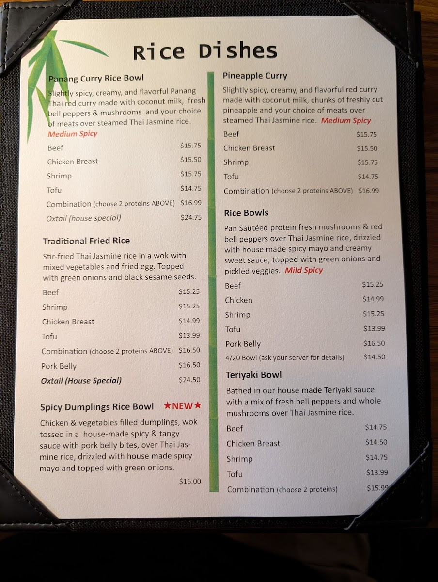 Oxtail beef, slightly spicy, creamy, and flavorful curry made with coconut milk, seasonal vegetables and your choice of meats over steamed thai jasmine rice. Topped with pickled veggies, cilantro, green onions and lime