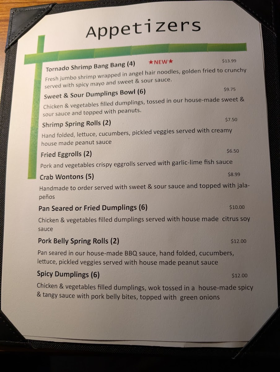 Pork or chicken and vegetables steamed dumplings, wok tossed in a spicy and tangy sauce, pork belly bites, green onions, and chili flakes